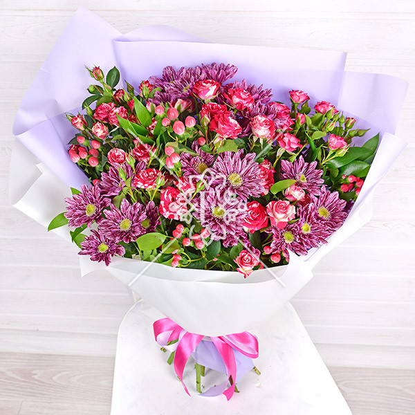 Букет составлен из чудесных кустовых роз и хризантем, украшен нежным и очаровательным гиперикумом. Цветы прекрасно сочетаются, выглядят гармонично и привлекают восторженный взгляд!